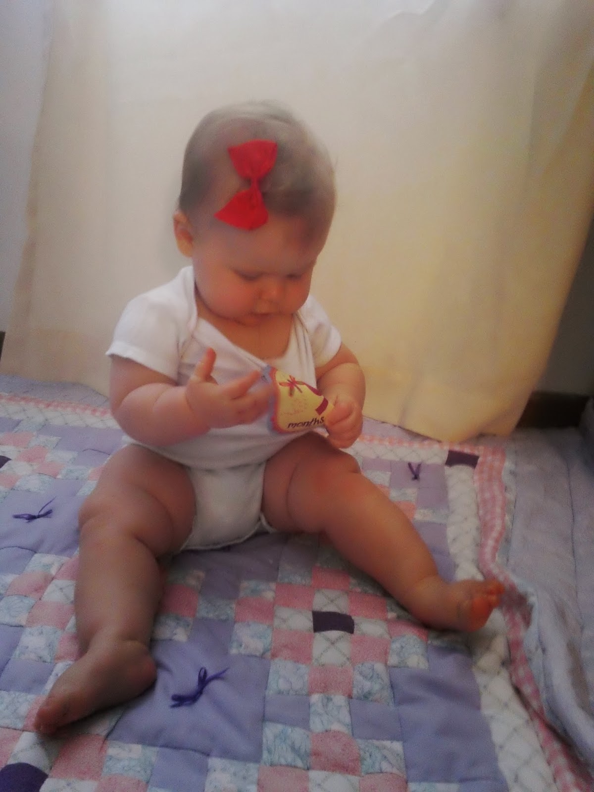 Changes in Appearance: Carly now officially has 4 chompers (teeth). She has hairs on her head that barely touch her eyebrows now! Her hair is long and thick enough now to clip an actual bow in it.